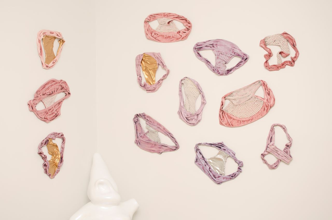 “Sunday” explores presence even in the absence of the human, and the projection of loaded context and themes thrown upon something so inert and everyday as panties in collection — striking tones of auto-eroticism and fetishistic admiration, or obsessive and voyeuristic compilation. Gamble’s small addition of glitter and jewels on the inside of the crotch lining offers up the duality of revealing such intimate proximity, whilst celebrating and revelling in female sexuality. 49 panties - various sizes -