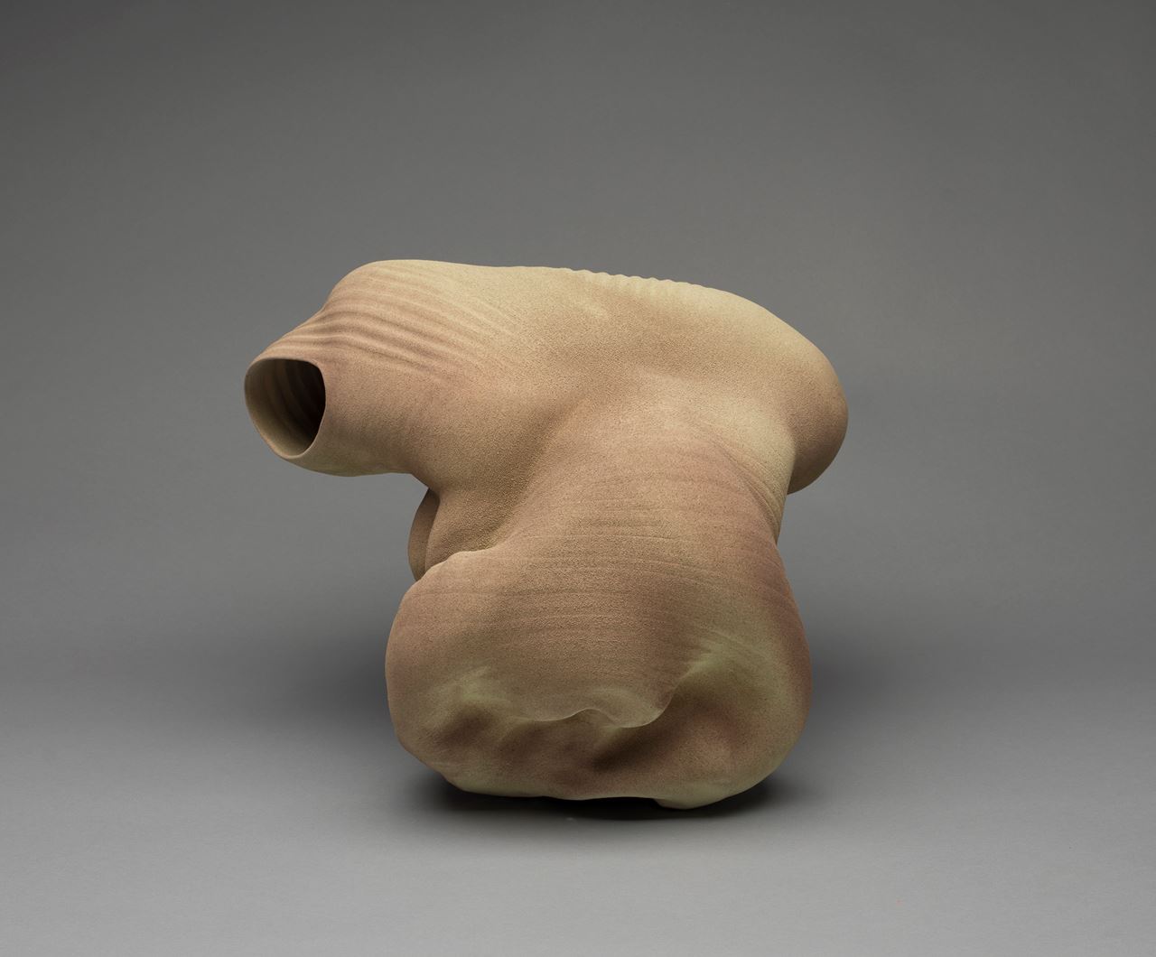 Beginning with standard, symmetrical thrown pots, Anne Marie Laurels slowly pulls, stretches and deforms the still-wet clay to a new, unique and semi-spontaneous shape. The lustrous physicality of the vessel reveals the movement of the artists hand and the fluency and overall plasticity of the base material in a flesh-like tonality, built in a gradient of matte glazes. Belgian clay thrown on the wheel, altered and assembled clayglazes